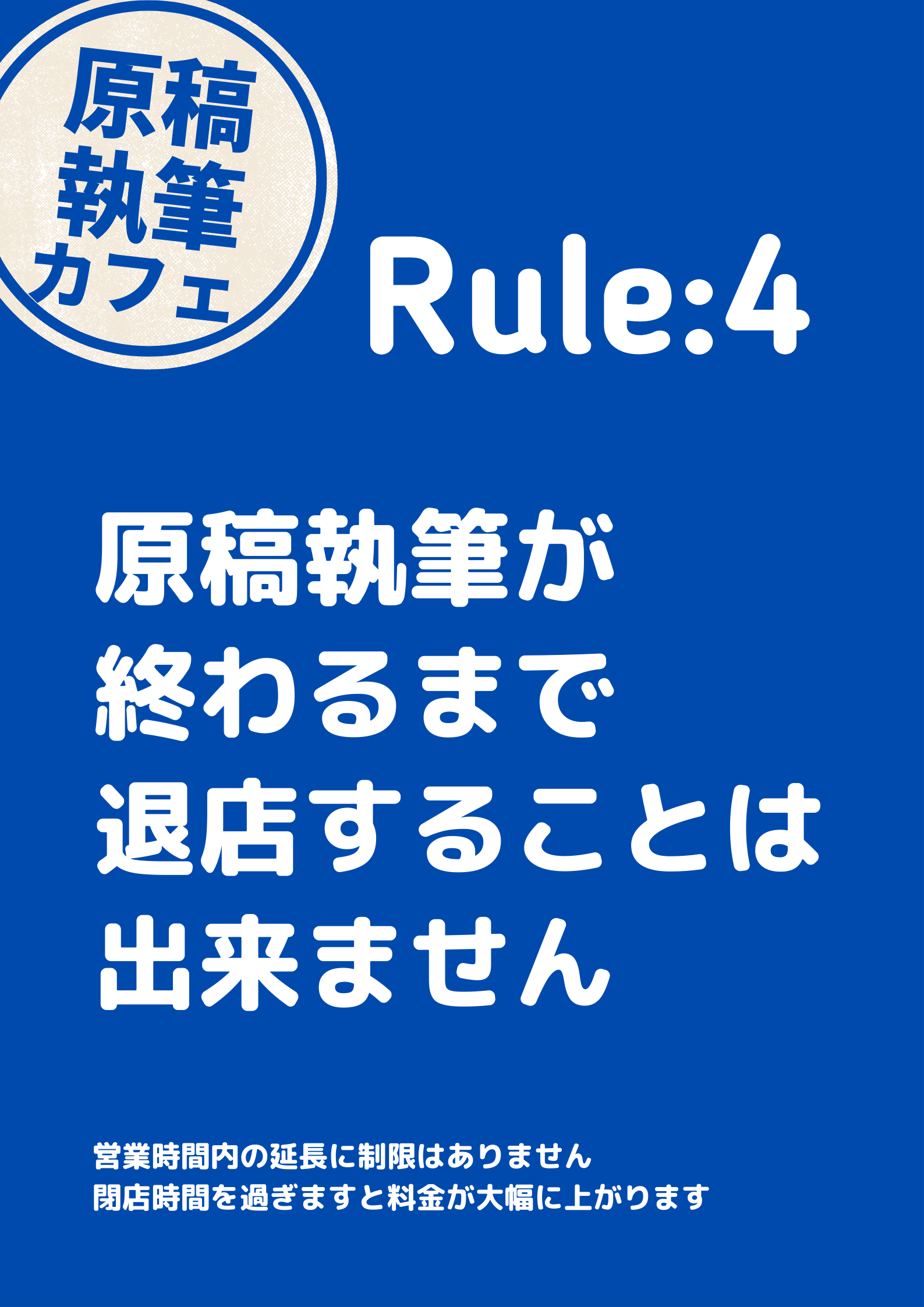 A:閉店後も執筆は出来ますので原稿を完成させてください。ただし、超過料金をいただきます。利用料金をご参照ください。入店時に記入いただく「作業目標」を「達成」していただくことが当店の存在意義です。自分の執筆速度と滞在予定時間を前提に達成可能な「作業目標」をたててください。