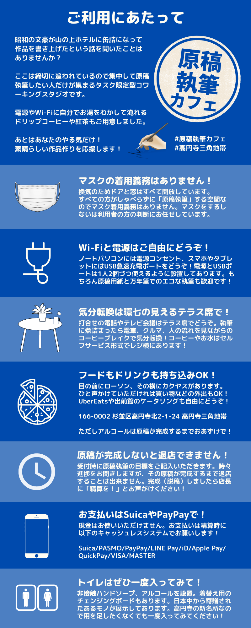 ご利用は「原稿執筆」を目的とした方に限定させていただきます。「原稿執筆」は「書籍」「雑誌」「論文」「脚本」「同人誌」「譜面」「スコア」の執筆、「翻訳作業」「漫画作画」「イラスト作成」「コピーライティング」「企画書作成」「ネーム入れ」「編集作業」「校正作業」「レイアウト作業」「写真加工」「画像加工」「動画編集」など創作活動全般を含みます。店内で会話は出来ません。