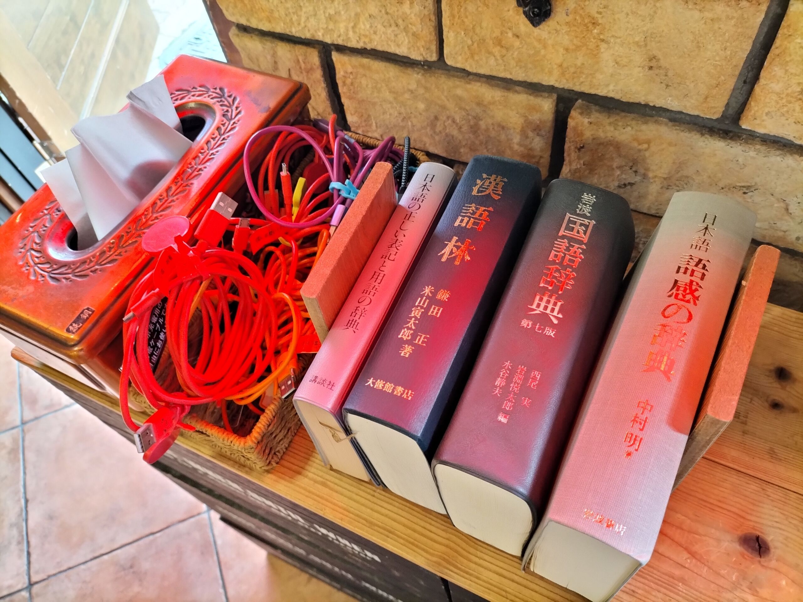 A:「国語辞典 第7版」(岩波)「漢語林」(大修館書店)「日本語 類義語の辞典」(岩波)「日本語の正しい表記と用語の辞典」(講談社)をドリンクコーナー近くに常設しています。店内でご自由に参照ください。寄贈したい辞書などありましたらお気軽にお持ちください。