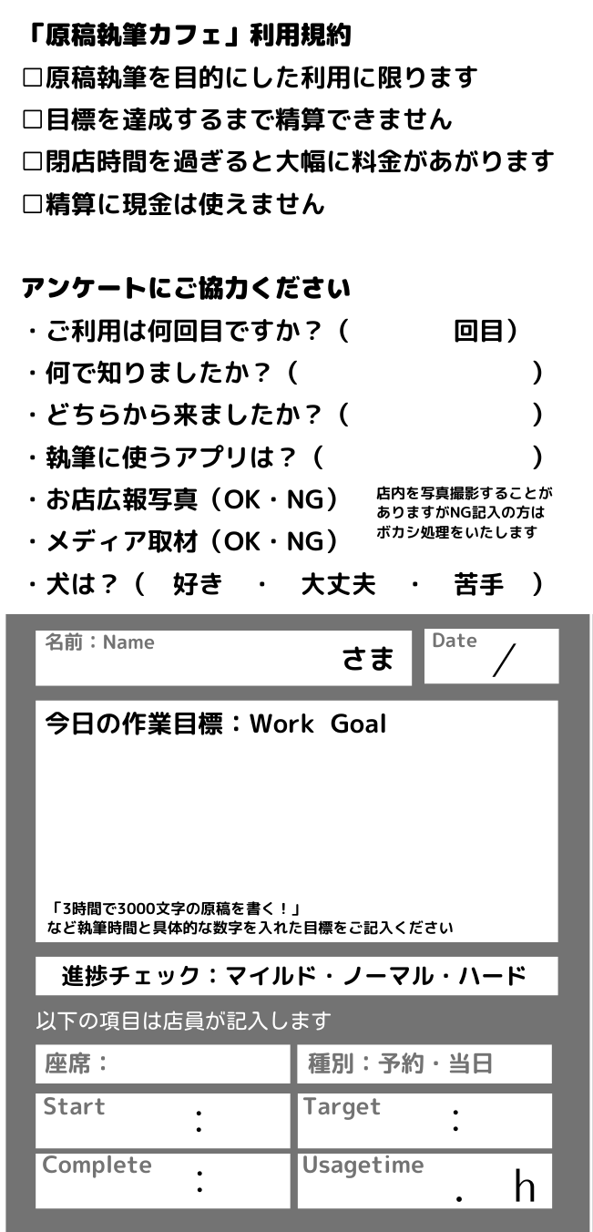 入店時にこちらのカードに記入いただきます。利用規約に納得いただけたらチェックボックスにレ印を入れてください。アンケート項目へのご協力もお願いしています。写真撮影やメディア対応NGの方はメディアに席番を伝えて写り込んだ場合も撮影素材にボカシをかけます。犬は店長が飼い犬(まっちゃ/チワックス/♂/1才)を閉店間際に連れてくることがあるのでその参考にお聞きしています。作業目標は具体的な数字や時間を記入してください。進捗確認でその数字をもとにお聞きします。あくまで作業目標に対しての進捗確認なので店長が内容を見ることはありませんのでご安心ください。