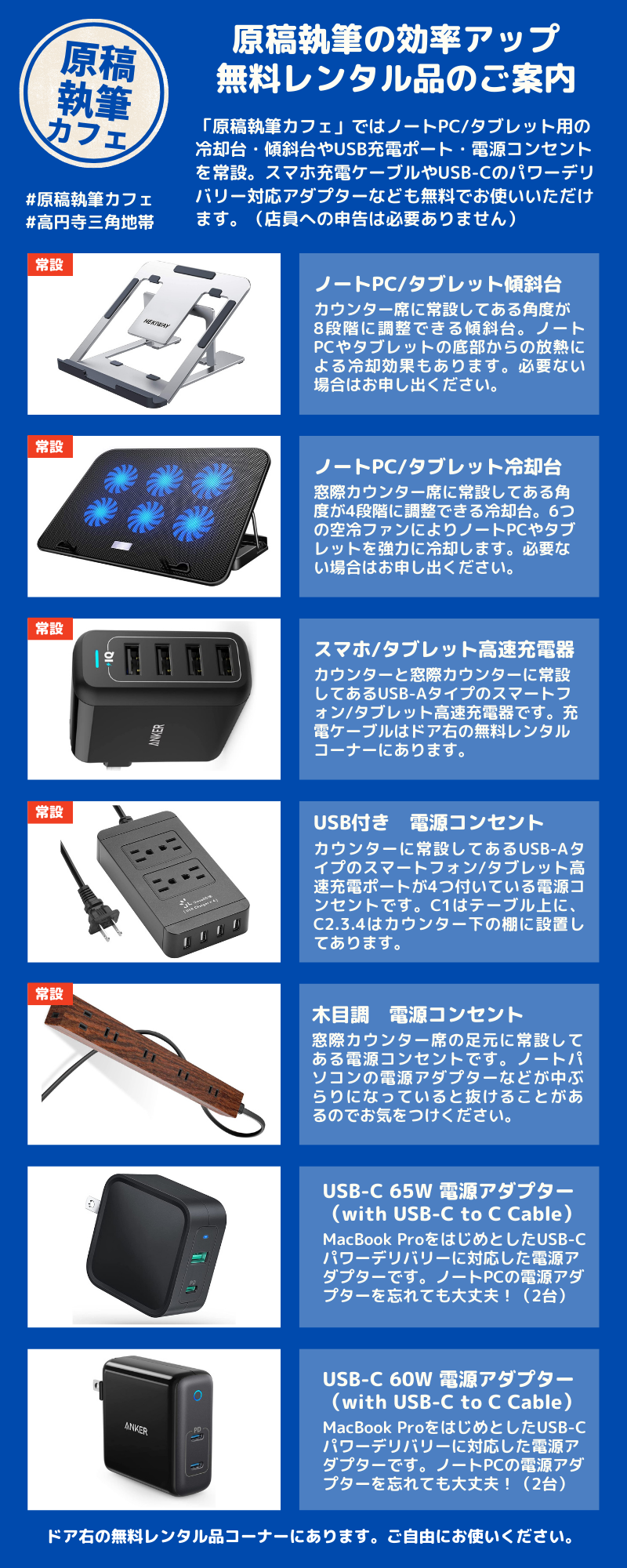 ※スマートフォン充電用ケーブル(Lightning/USB-C/USB-Micro)や辞書も店内で自由に使える