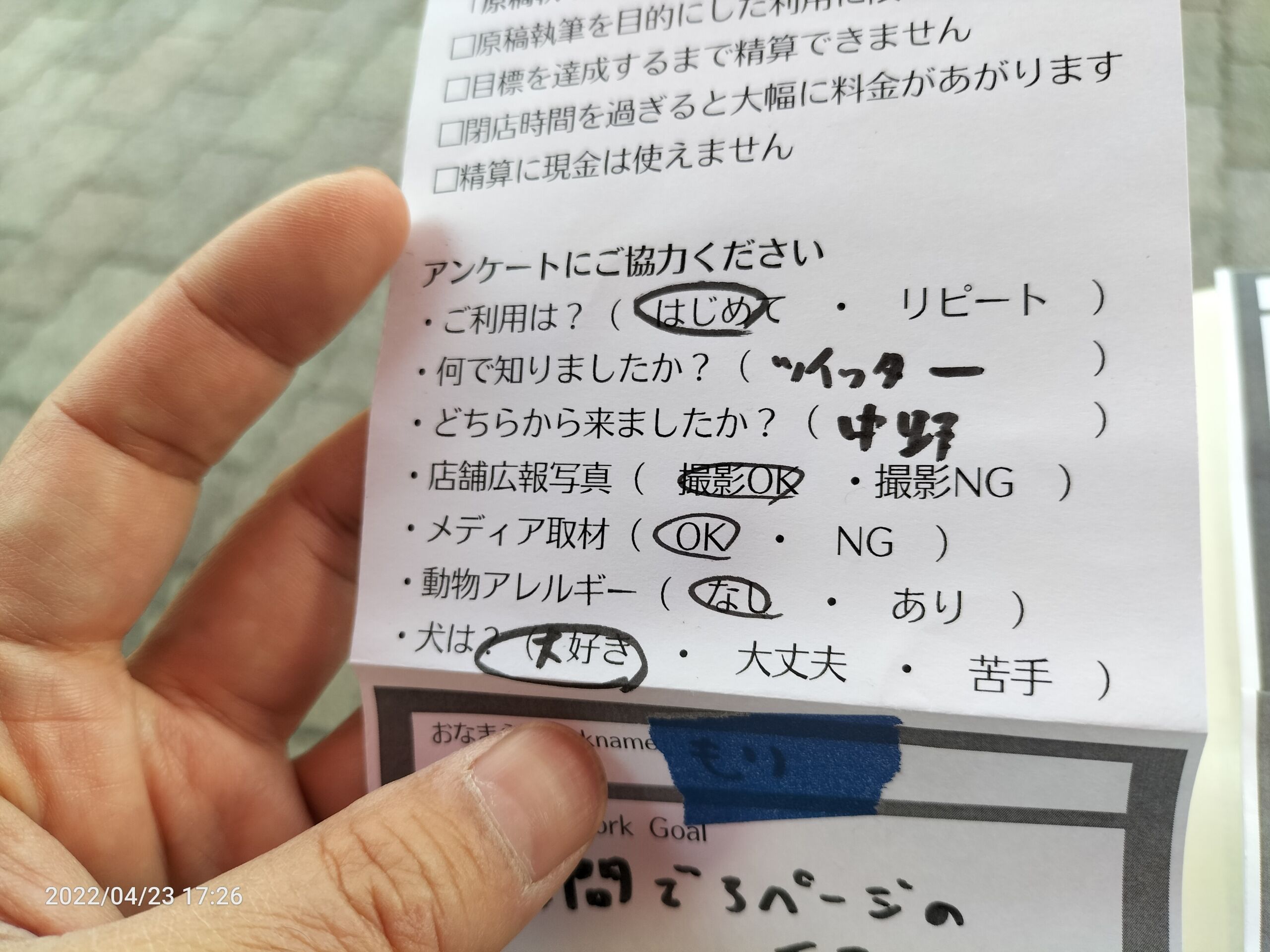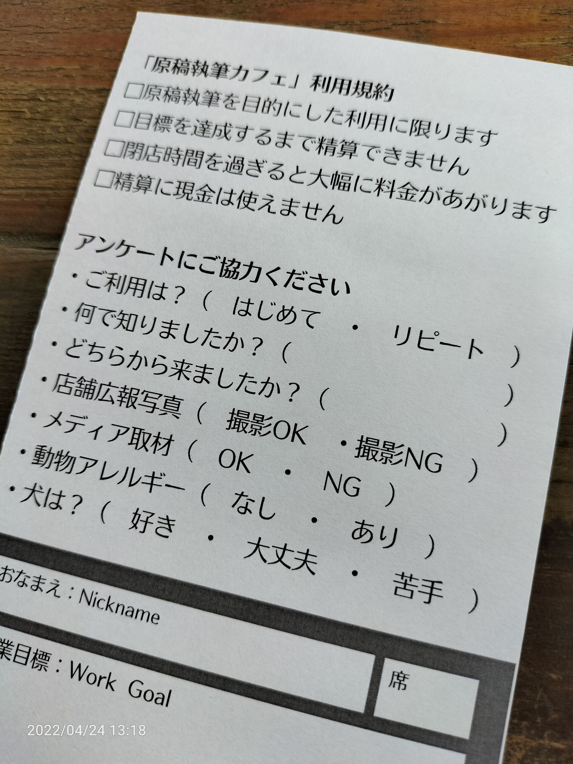 最適化:利用規約とアンケートと目標設定カードを1枚に集約して入店時に記入してもらう