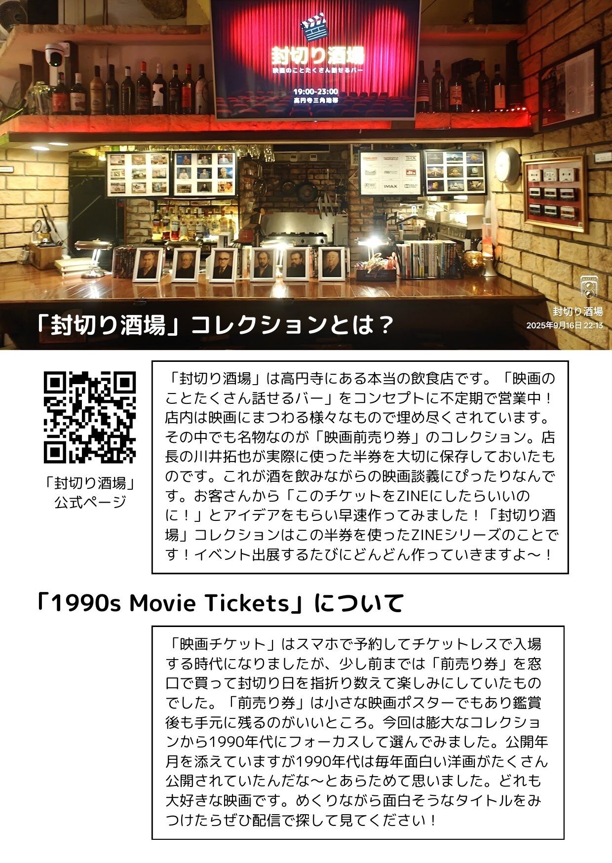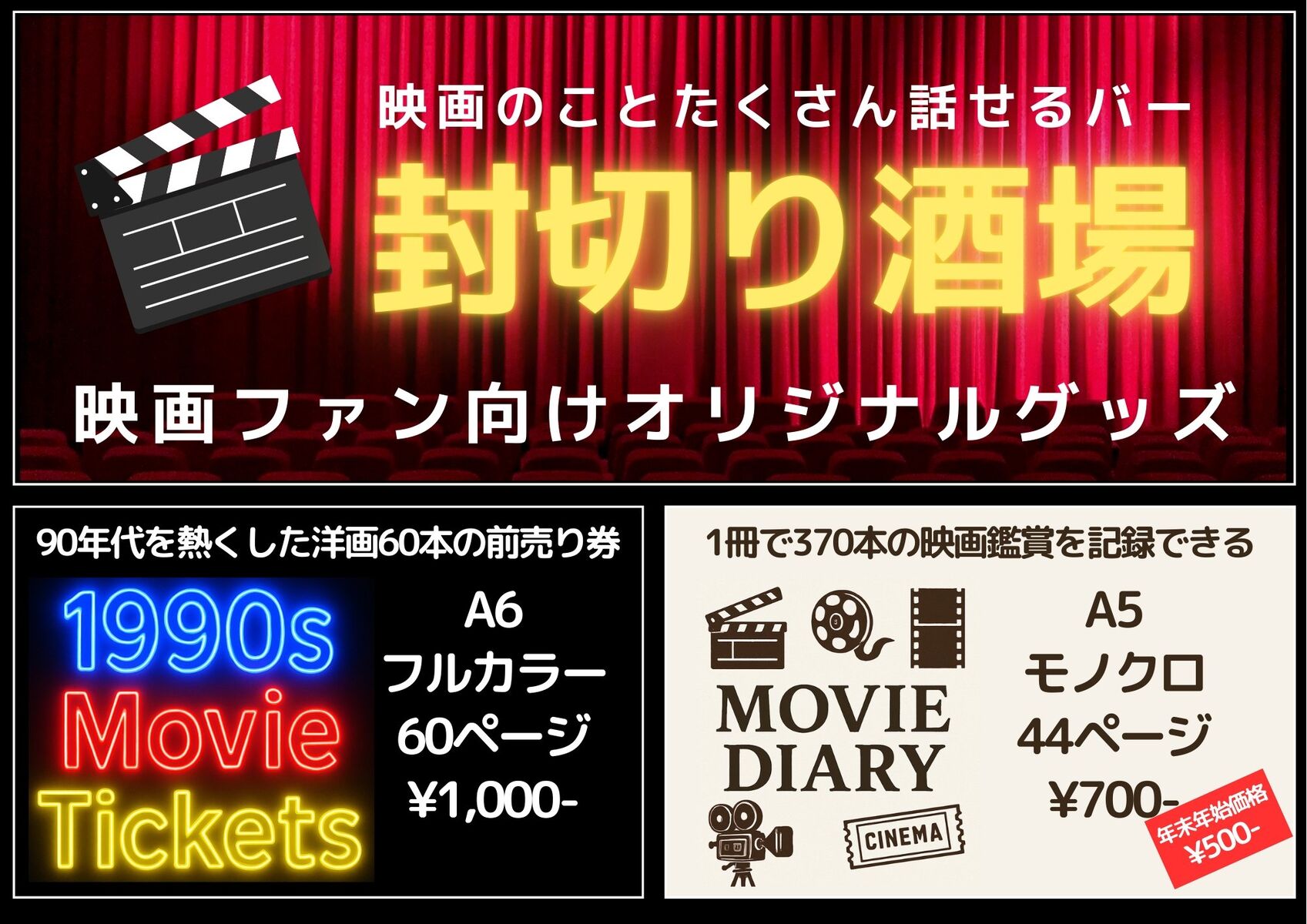 「高円寺三角地帯」で不定期に営業中の「封切り酒場」では店長が自分が欲しいグッズは自分で作る!という主義のもと「映画監督作品年表」「撮影監督作品年表」などを制作してきました。今回はこのマニアックな「作品年表」シリーズはお休みで新作「映画鑑賞日記」と「1990s Movie Tickets」の2冊で出展します!