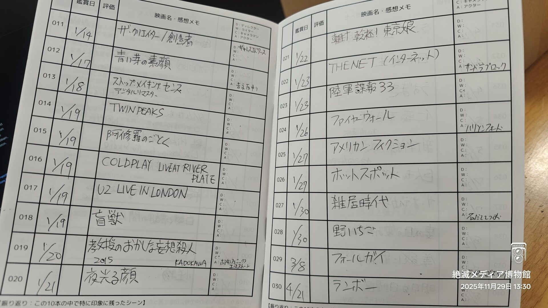 早速自分も2025年に観た映画を書き込んで使い心地を試してみました。日付の横には評価という欄があるので点数や★など自分で独自の評価軸を決めて記入することが出来ます。どんな評価軸にしようか?と考えてる段階の写真なのでまだ空欄です。映画タイトルは感想とともに大きめの欄になっており最後の欄は主要スタッフやキャストを記入するようになっています。