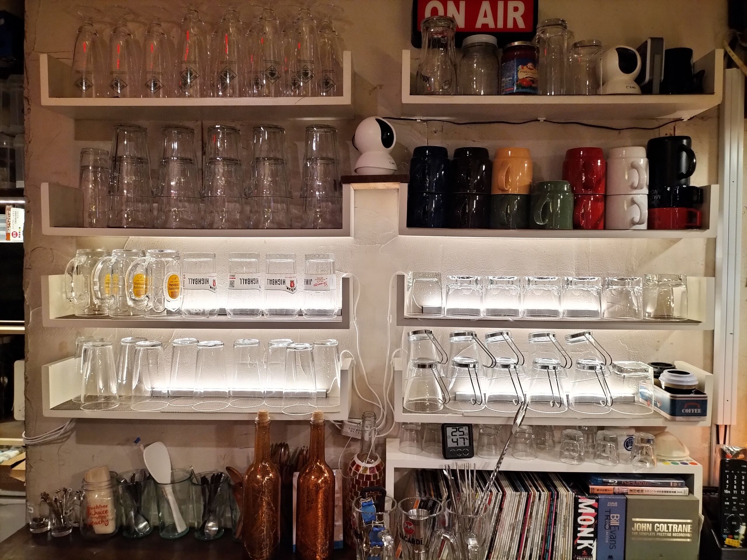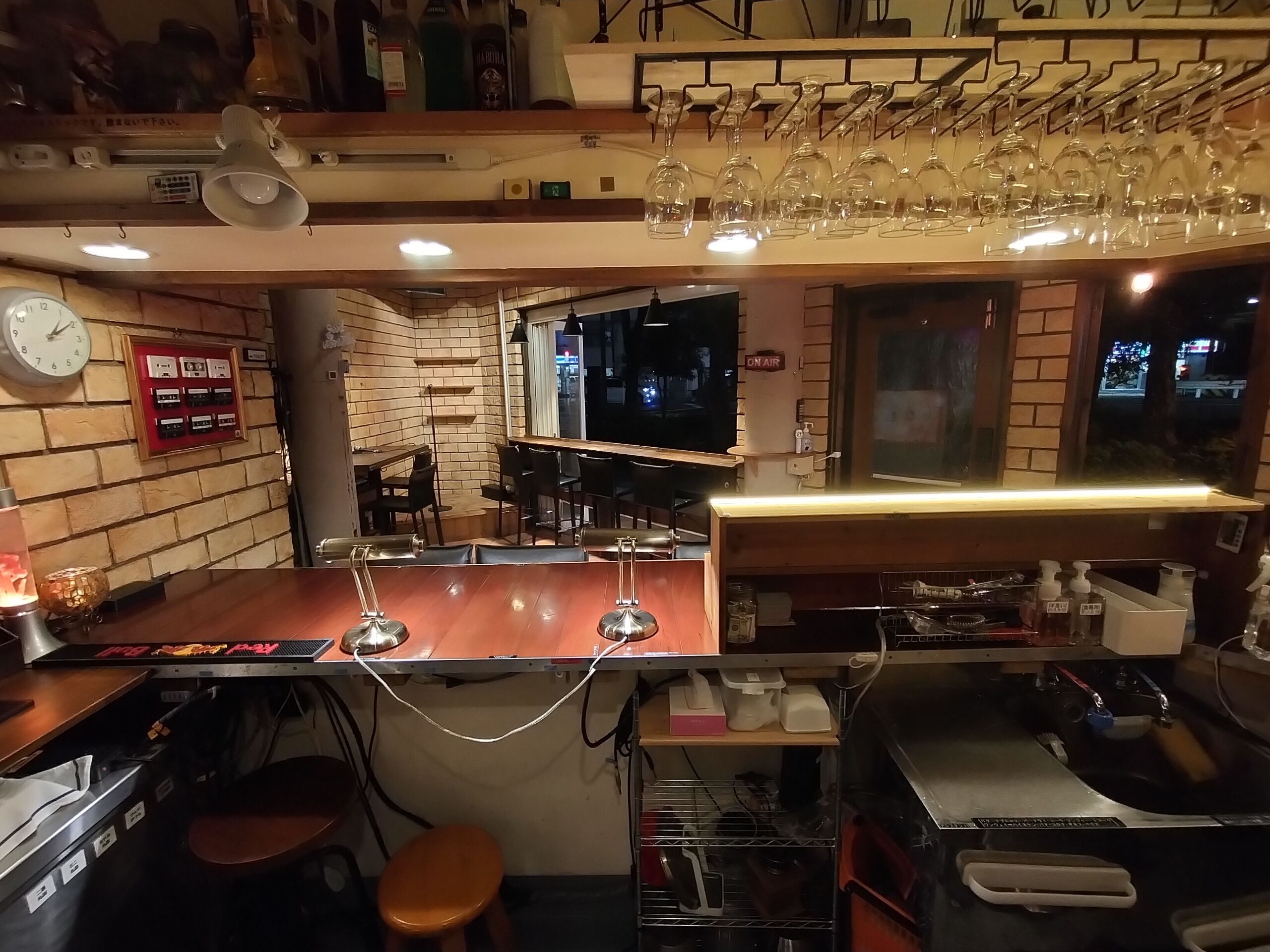店内BGM用のオーディオはカウンター上にステレオスピーカー、デルタステージ上にモノラルスピーカーの三角サラウンド。それぞれ独立して入力できるので飲食店としてもイベントスペースとしても音のアウトプットが自由自在です。映像モニターもキッチン・フード上、カウンター上、デジタルステージ上に3面あり同じ映像を出力することも個別に変えることでも出来ます。