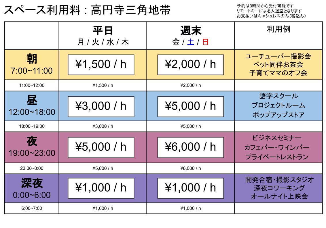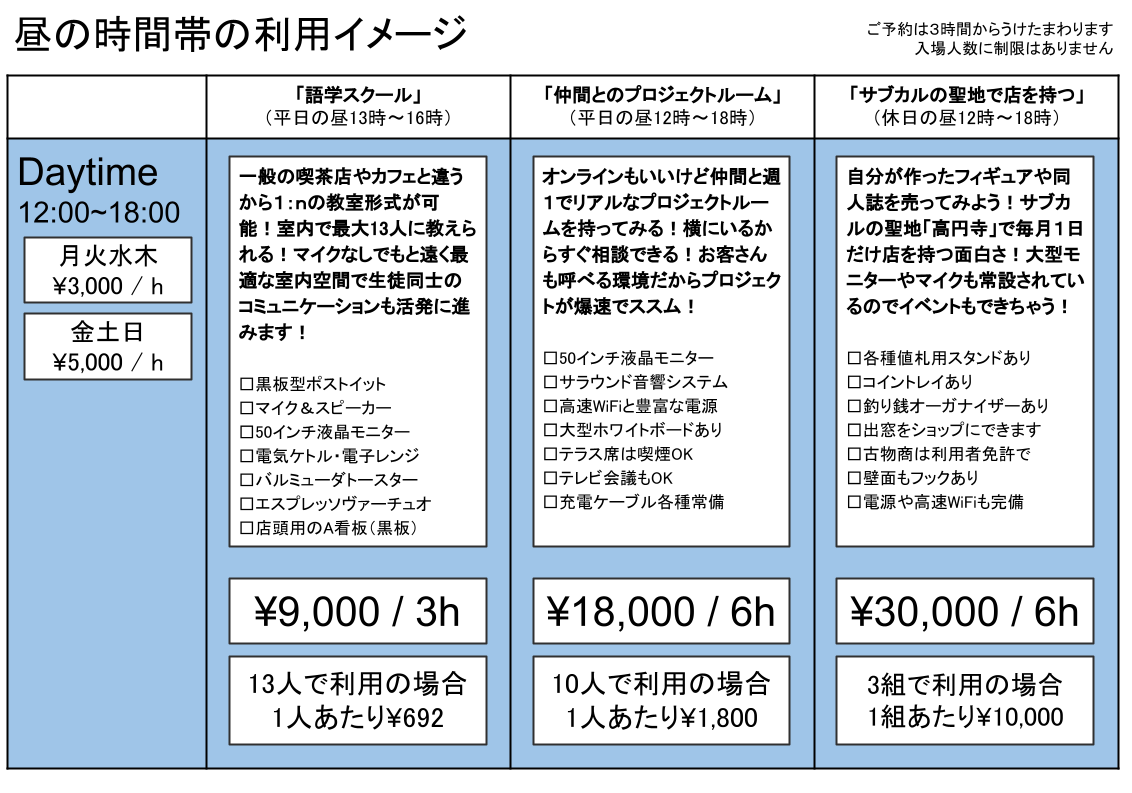 ※枠を連続して使いたい場合の間の1時間は前の時間枠と同じ料金でご利用いただけます。